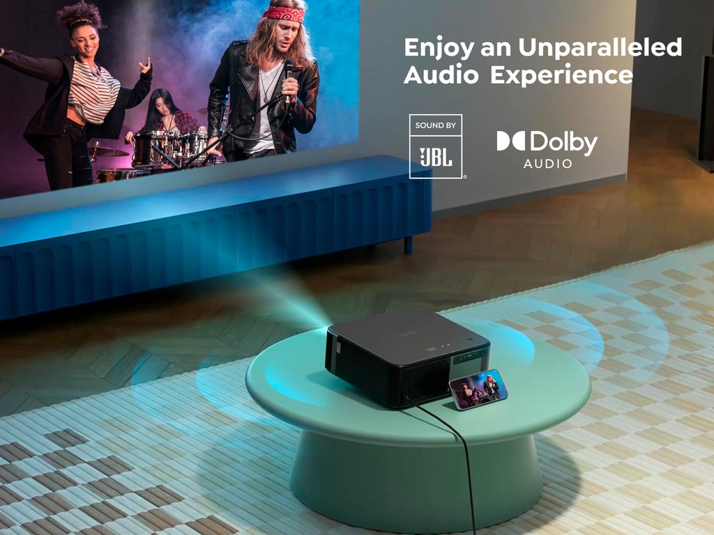 This smart projector bringing together all the latest technologies of the day. With NFC technology, simply tapping your NFC-enabled phone to the projector, you can effortlessly cast movies to your screen. Auto focus & keystone correction (with built-in latest sensor) can achieve perfect image alignment and sharp visuals at any time, ensuring a hassle-free and unparalleled viewing experience both indoors and outdoors. Dolby/JBL 360° Stereo Surround Sound: The built-in dual 10W JBL stereo speakers of this home cinema projector, coupled with Dolby Audio support, Yaber K2s projector truly achieves transparent treble, clear vocals, and powerful bass. This 4k projector creates a dynamic & immersive sound experience that elevates movie nights, gaming sessions, and presentations to new heights. Built-in TV Dongle With 7000+ APPS: Universe Entertainment is right in your eyes!